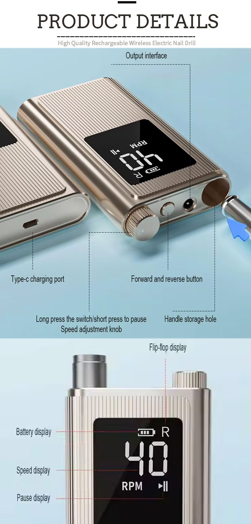 طريقة تشغيل مثقاب الأظافر الاحترافي عالي السرعة 40,000 دورة في الدقيقة، أي التوصيل والسحب، سهل ومريح، يمكن استخدام الاستبدال بعد الانتهاء.