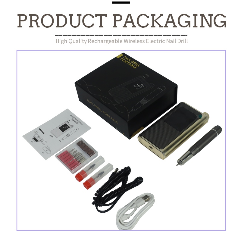 يحتوي محتوى حزمة مثقاب الأظافر الاحترافية عالية السرعة 40,000 دورة في الدقيقة على منتج قلم سنفرة وكابل شحن USB ودليل تعليمات المنتج وصندوق خفيف الوزن ومحمول.