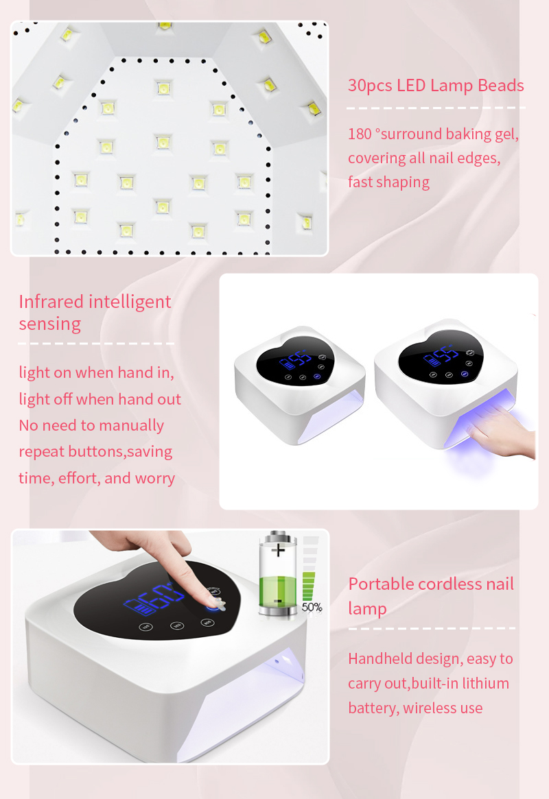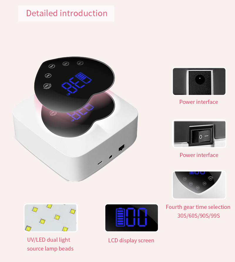 يضمن المنتج تجفيف الغراء بشكل متساوٍ دون انكماش. توفر مصادر الضوء المزدوجة تسخينًا لطيفًا لمنع تغير لون اليد وإجهاد العين، وهي مناسبة لكل من اليدين والقدمين، مما يوفر نتائج تجفيف سريعة بشكل ملحوظ.