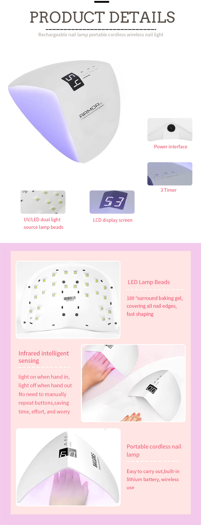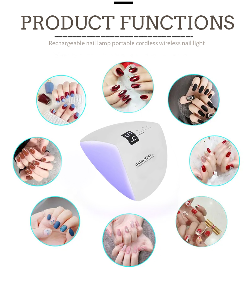 يضمن المنتج تجفيف الغراء بشكل متساوٍ دون انكماش. توفر مصادر الضوء المزدوجة تسخينًا لطيفًا لمنع تغير لون اليد وإجهاد العين، وهي مناسبة لكل من اليدين والقدمين، مما يوفر نتائج تجفيف سريعة بشكل ملحوظ.