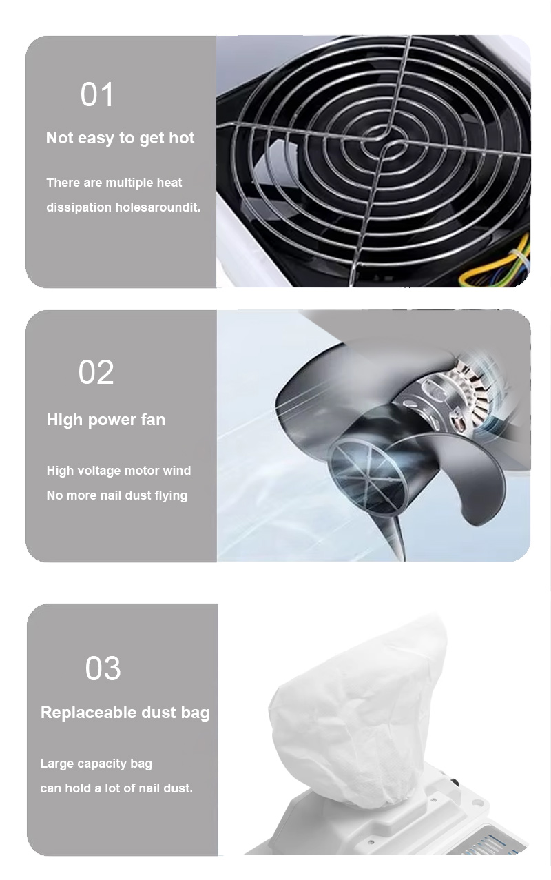 منتجات امتصاص قوي لحطام الأظافر لا تسرب الغبار، وتحافظ على سطح الطاولة نظيفًا ومرتبًا، والمكنسة الكهربائية السريعة لا تسرب الغبار بقوة عالية أكثر كفاءة.