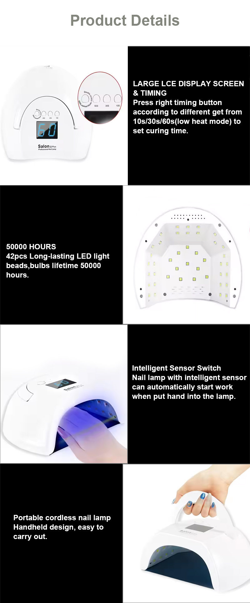 يضمن المنتج تجفيف الغراء بشكل متساوٍ دون انكماش. توفر مصادر الضوء المزدوجة تسخينًا لطيفًا لمنع تغير لون اليد وإجهاد العين، وهي مناسبة لكل من اليدين والقدمين، مما يوفر نتائج تجفيف سريعة بشكل ملحوظ.