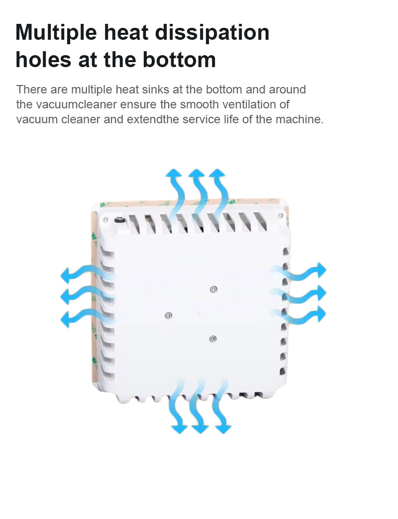 يحتوي الجزء السفلي من المنتج على فتحات تبريد للتهوية السلسة، كما تم تصميم المكنسة الكهربائية بفتحات تبريد متعددة في الجزء السفلي وفي كل مكان لضمان تهوية سلسة وإطالة عمر الجهاز.
