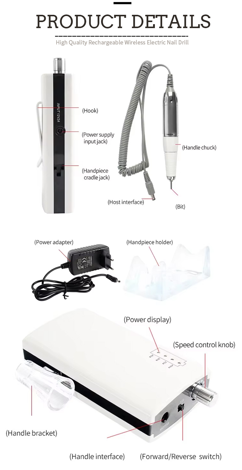 ماكينة مثقاب أظافر لاسلكية قابلة لإعادة الشحن، قوية 45 وات 40000 دورة في الدقيقة