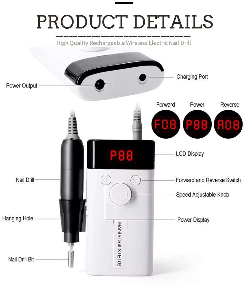 ماكينة مثقاب أظافر لاسلكية قابلة لإعادة الشحن، قوية 45 وات 40000 دورة في الدقيقة