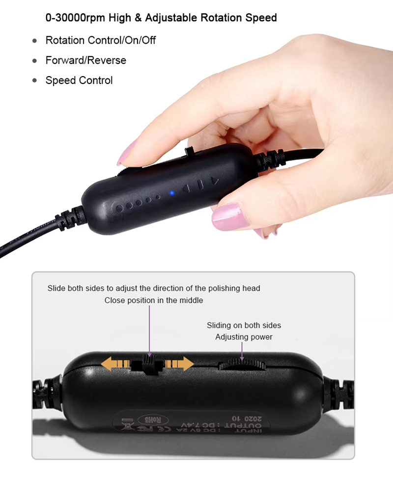 1، سرعة قابلة للتعديل، محرك قوي، صنفرة عالية السرعة، مقبض لا نهائي لتعديل السرعة في الوقت الحقيقي.