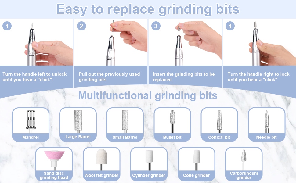 طريقة تشغيل المثقاب البديلة لمجموعة مثقاب الأظافر المحمولة منخفضة الضوضاء، أي التوصيل والسحب، سهلة ومريحة، يمكن استخدام الاستبدال بعد الانتهاء.