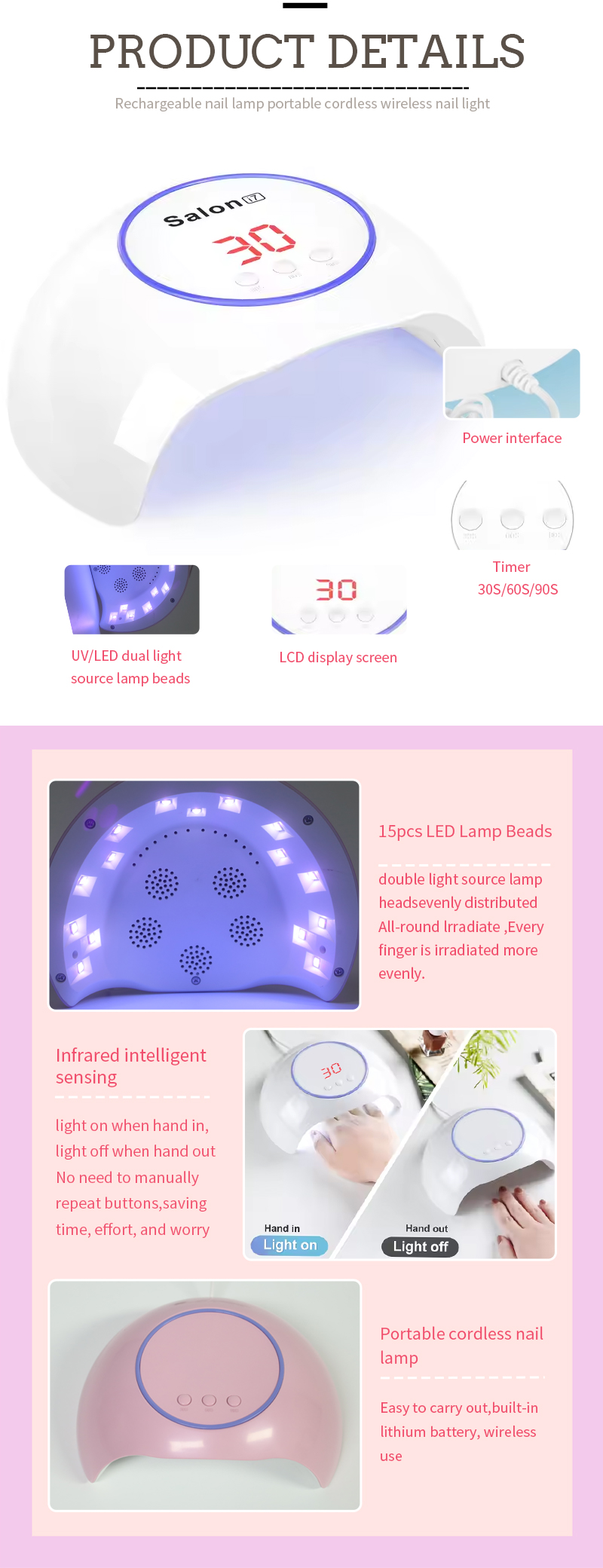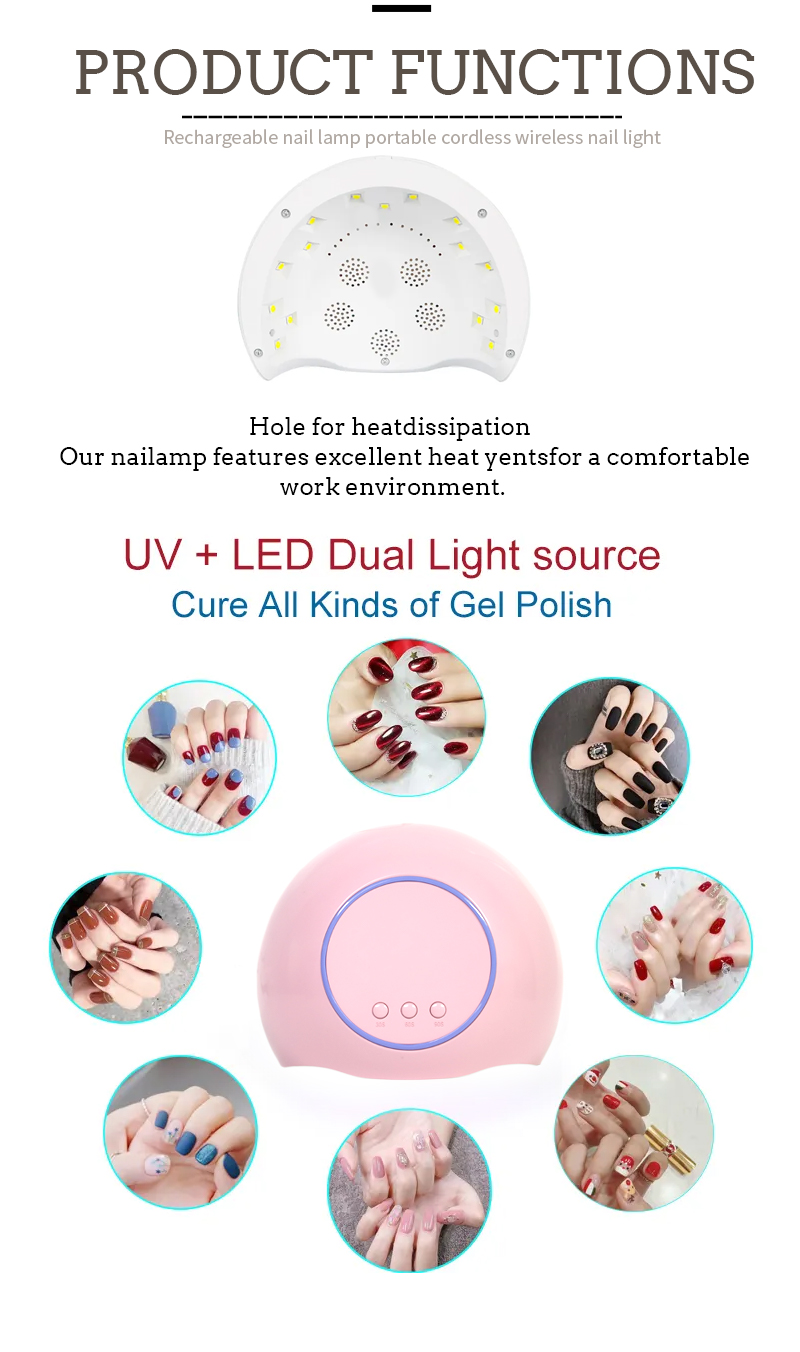 يضمن المنتج تجفيف الغراء بشكل متساوٍ دون انكماش. توفر مصادر الضوء المزدوجة تسخينًا لطيفًا لمنع تغير لون اليد وإجهاد العين، وهي مناسبة لكل من اليدين والقدمين، مما يوفر نتائج تجفيف سريعة بشكل ملحوظ.