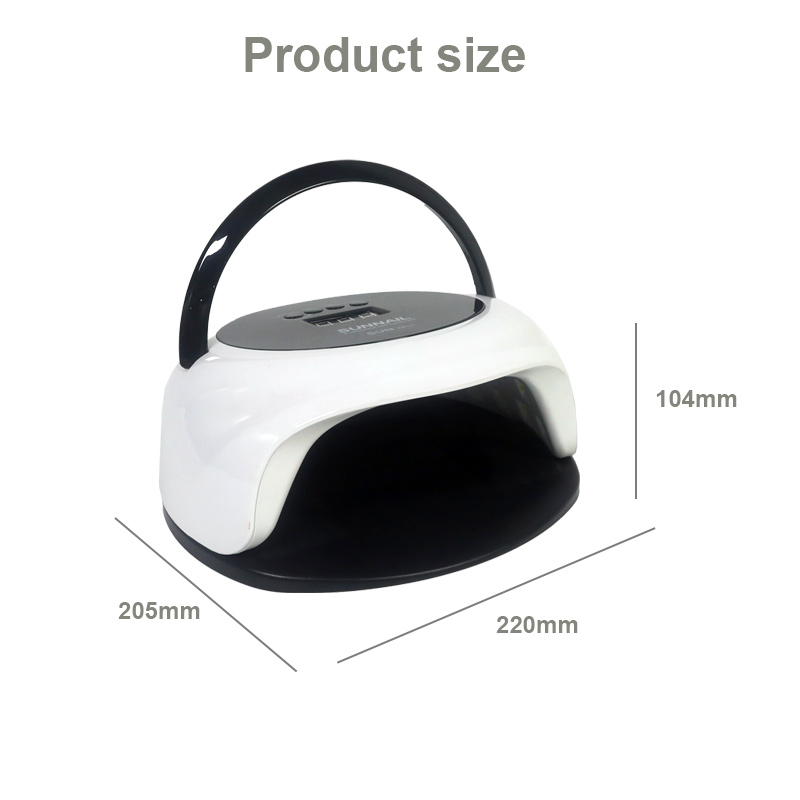 أبعاد مصباح تجفيف الأظافر مع وظيفة الاستشعار التلقائي هي 205 ملم في الطول، 220 ملم في العرض و104 ملم في الارتفاع، مع سعة كبيرة والقدرة على استخدام اليدين والقدمين، وهو مريح للغاية.