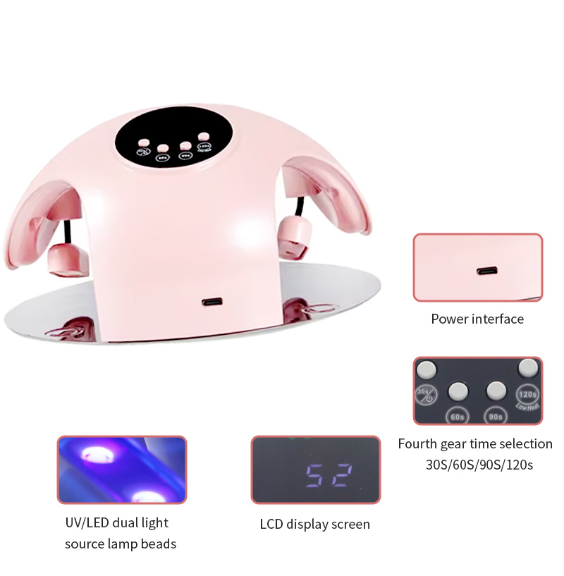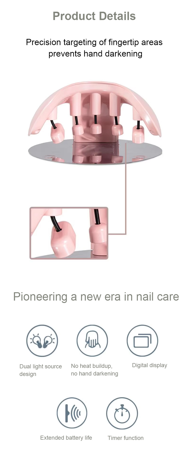 يضمن المنتج تجفيف الغراء بشكل متساوٍ دون انكماش. توفر مصادر الضوء المزدوجة تسخينًا لطيفًا لمنع تغير لون اليد وإجهاد العين، وهي مناسبة لكل من اليدين والقدمين، مما يوفر نتائج تجفيف سريعة بشكل ملحوظ.