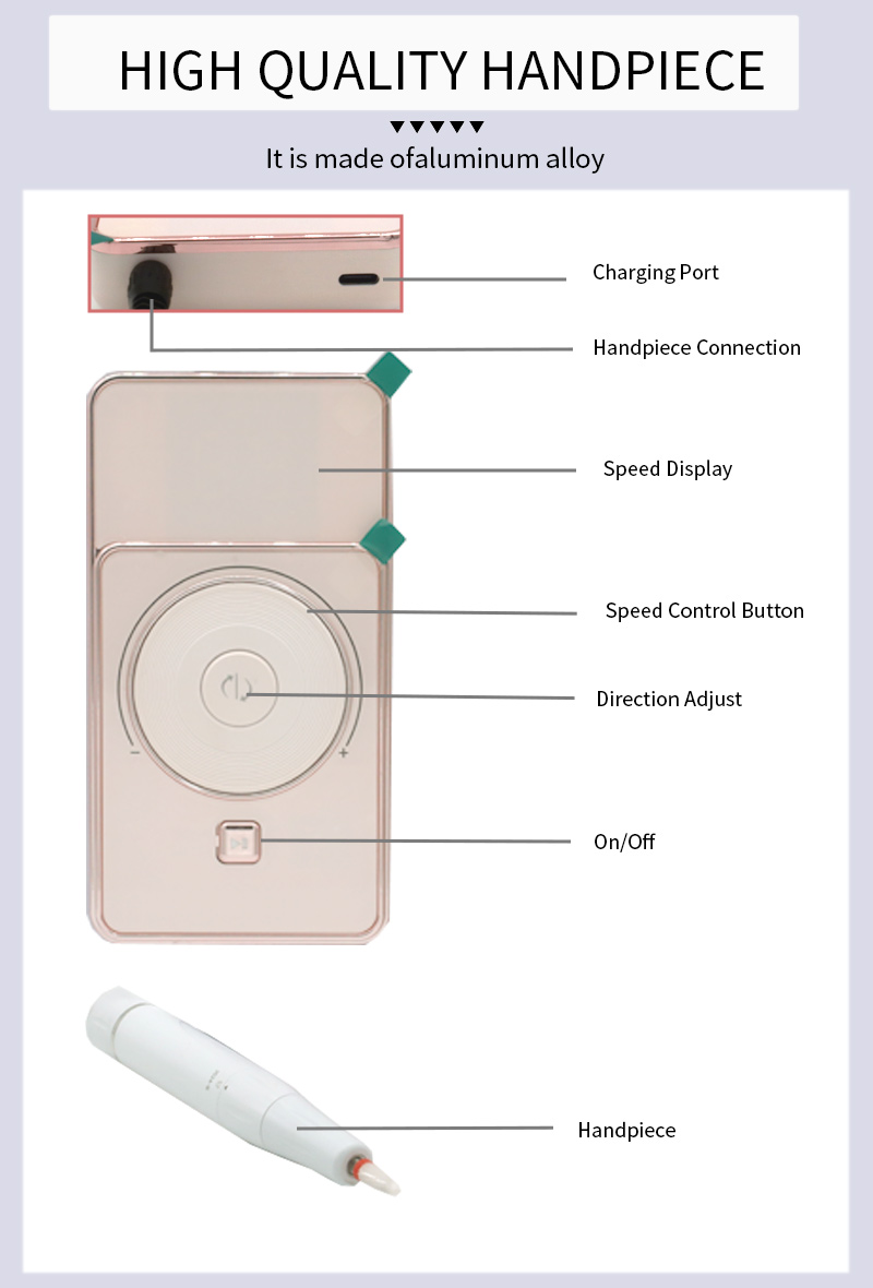 تصميم عرض قلم الطحن عالي السرعة ومنخفض الضوضاء، مع مقبس قلم الصنفرة، شاشة الكريستال السائل LCD يمكن أن تظهر عدد الثورات/الطاقة/الاتجاه، مقبض مفتاح السرعة، زر تبديل في اتجاه عقارب الساعة/عكس اتجاه عقارب الساعة، زر الإيقاف المؤقت، محرك احترافي 30,000 دورة في الدقيقة، رأس طحن بقفل لولبي.