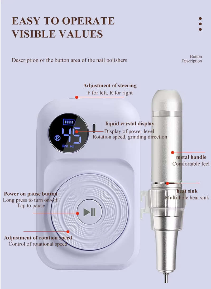 هذا التصميم الممتاز لقلم الطحن منخفض الضوضاء، مع مقبس قلم الصنفرة، وشاشة الكريستال السائل LCD يمكن أن تظهر عدد الثورات/الطاقة/الاتجاه، ومقبض مفتاح السرعة، وزر تبديل في اتجاه عقارب الساعة/عكس اتجاه عقارب الساعة، وزر الإيقاف المؤقت، ومحرك احترافي 30,000 دورة في الدقيقة، ورأس طحن بقفل لولبي.