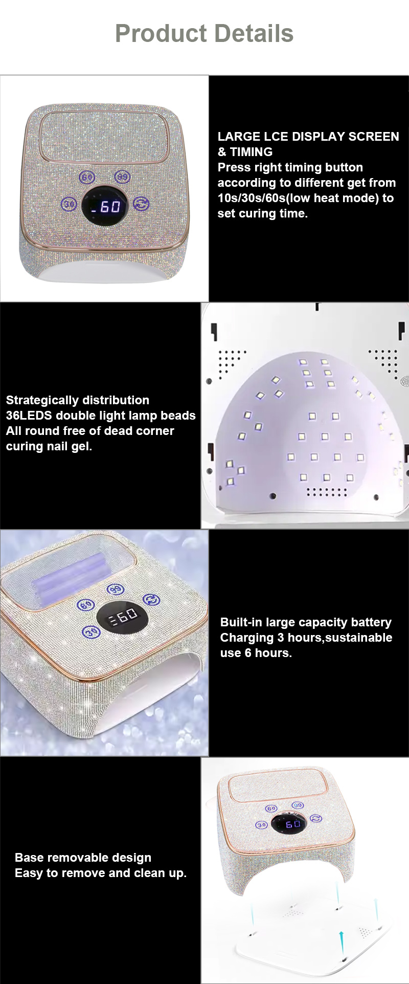 يضمن المنتج تجفيف الغراء بشكل متساوٍ دون انكماش. توفر مصادر الضوء المزدوجة تسخينًا لطيفًا لمنع تغير لون اليد وإجهاد العين، وهي مناسبة لكل من اليدين والقدمين، مما يوفر نتائج تجفيف سريعة بشكل ملحوظ.
