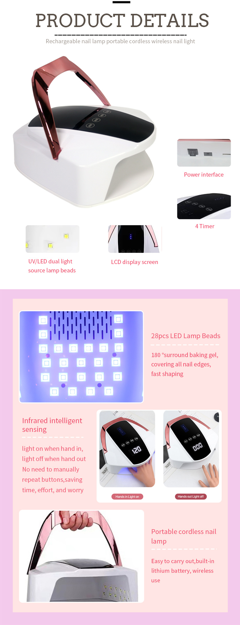 يحتوي مصباح طلاء الأظافر القابل لإعادة الشحن على ظهور المنتج 90W المحترف في تصميم الأخدود ، ويمكن استخدام المقبض في الأخدود كدور مقبض محمول ، مما يجعله أكثر ملاءمة للحمل والطرح. كما أنه يتجنب عيب المقبض الذي يتم كسره بسهولة وسحبه.