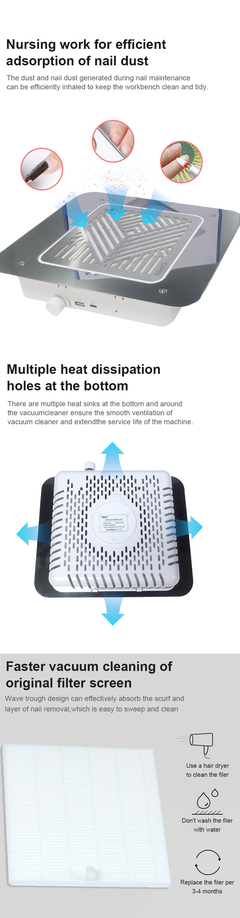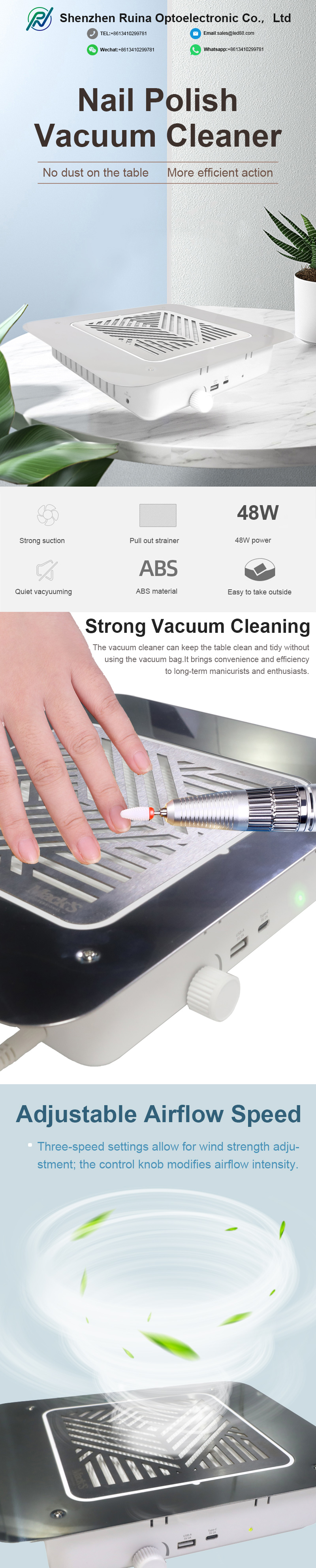 منتجات امتصاص قوي لحطام الأظافر لا تسرب الغبار، وتحافظ على سطح الطاولة نظيفًا ومرتبًا، والمكنسة الكهربائية السريعة لا تسرب الغبار بقوة عالية أكثر كفاءة.