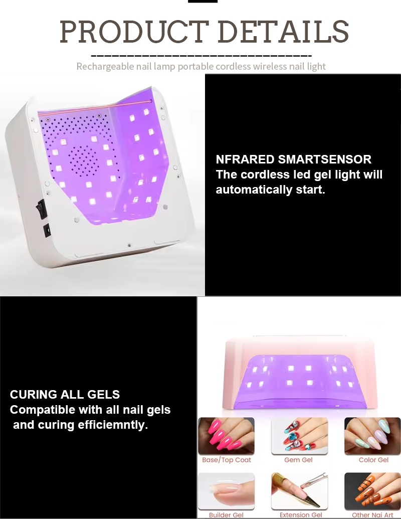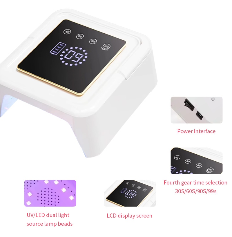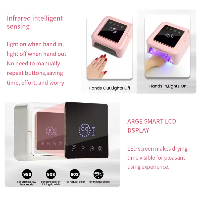 يتميز مصباح تجفيف الأظافر المربع بتقنية الاستشعار الذكية بالأشعة تحت الحمراء التي تضيء تلقائيًا عندما تقترب الأيدي وتنطفئ عندما تتحرك الأيدي بعيدًا - مما يزيل متاعب الضغط المتكرر على الأزرار ويوفر الوقت والجهد. لا يتطلب غراء الخبز عالي الطاقة انتظارًا طويلًا، مما يوفر الوقت والجهد.