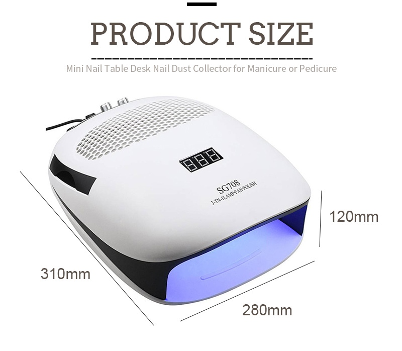 أبعاد مصباح الأظافر المحمول ثلاثي التركيب مع الوسادة هي 310 مم في الطول، 280 مم في العرض و120 مم في الارتفاع، مع سعة كبيرة والقدرة على استخدام اليدين والقدمين، وهو مريح للغاية.